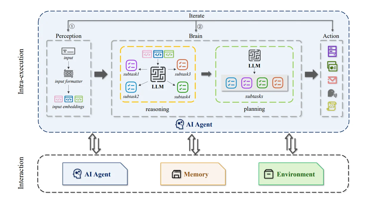 At the heart of every AI agent lies three essential components: perception, brain, and action. As illustrated in the diagram below, these components form a sophisticated processing pipeline while maintaining continuous iteration and interacting with external elements.